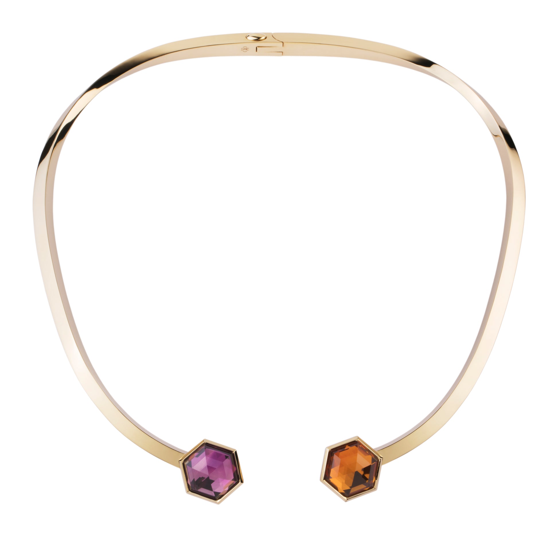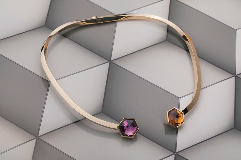 This open necklace is assembled from two elements designed in a special way. Each piece is slightly twisted along its axis to beautifully frame the neck. Аmethyst and citrine in the shape of a regular hexagons, allusions to the glass brick "falconier" number 7, are in the spotlight.